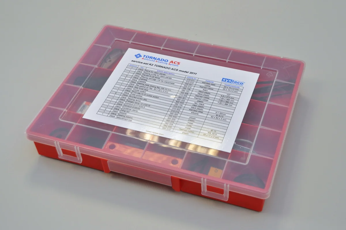 Das Set enthält diverse Kleinteile, die speziell für die Tornado ACS Reinigungsmaschinen entwickelt wurden. Eine detaillierte Auflistung der enthaltenen Teile ist auf Anfrage erhältlich.